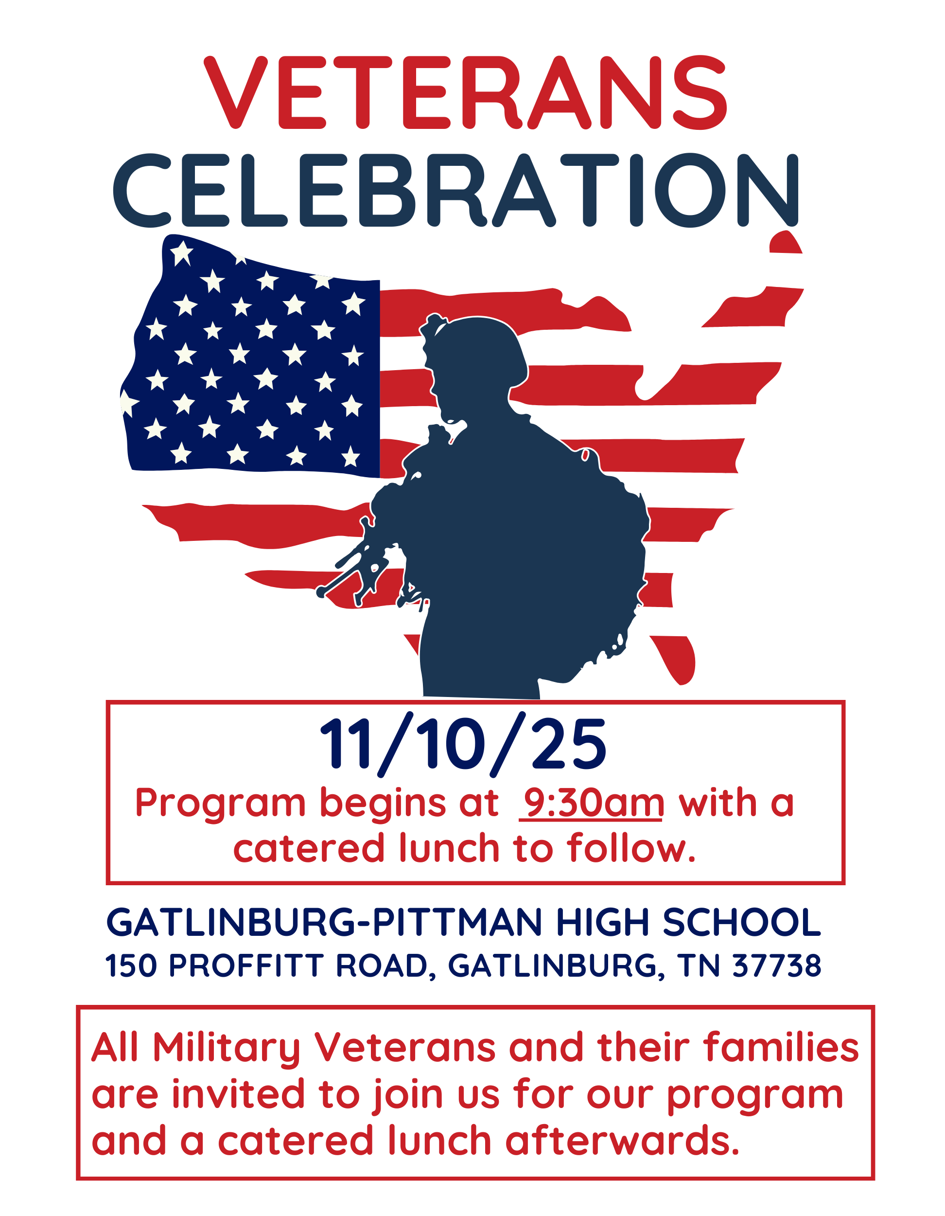 Gatlinburg-Pittman High School proudly invites all Military Veterans and their families to join us for our annual Veterans Day Program on Monday, November 10, 2025, at 9:30 a.m. in the Jack Parton Gym. . .